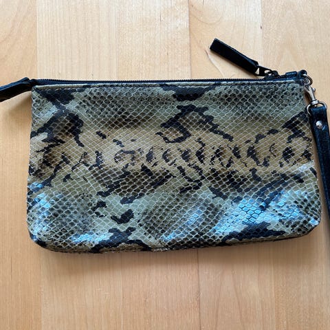 Parillä käytöllä ollut rannelaukku. Laukun sisällä useita taskuja ja ulkopuolella myös vetoketjullinen sivutasku. Laukussa pieni punainen tussinjälki, joka näkyy kuvassa. Laukun koko l 19,5 cm ja k 12,0 cm. Ostettu Stockmannilta.