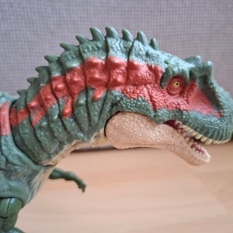 Mattelin valmistama Jurassic World sarjan tummanvihreän ja punaisen sävyissä oleva dinosauruslelu Sinotyrannys. Lelun pituus noin 35cm. Aika vähän leikitty. Selkäevän alla koodi jurassic world play-peliin. Selässä kaksi nappia joista toisella häntä heilahtaa ja toisella pää heilahtaa ja suu avautuu. Liikkuvat raajat, pää, suu ja häntä. Päähän voi myös laittaa tuommoisen erillisen "tracker"-kehikon. Tässä lelussa ei ole äänitoimintoa tai pattereita.