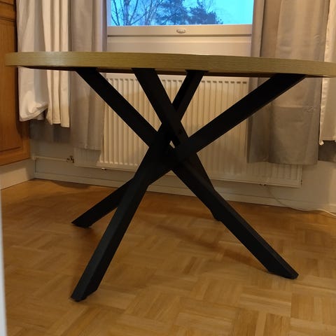 Pöydän halkaisija 130cm. Kuvan tuolit ei kuulu kauppaan. Ympärille mahtuu 4-6 tuolia. Pöytä on purettu osiin kuljetusta varten valmiiksi. Ei käytönjälkiä. Jalat sormipaneelin näköistä kivaa yksityiskohtaa.