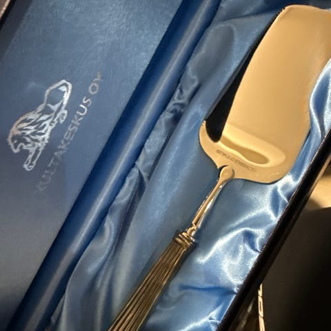 RomanticaHopea 830 hopeasta valmistettu kalaveitsi ja haarukka. Sarjan hopeaesineet, joissa on koristeellinen muotoilu. Sopii käytettäväksi kalaruokien tarjoilussa.