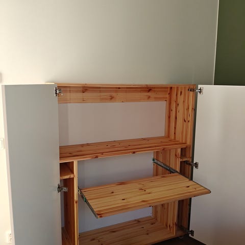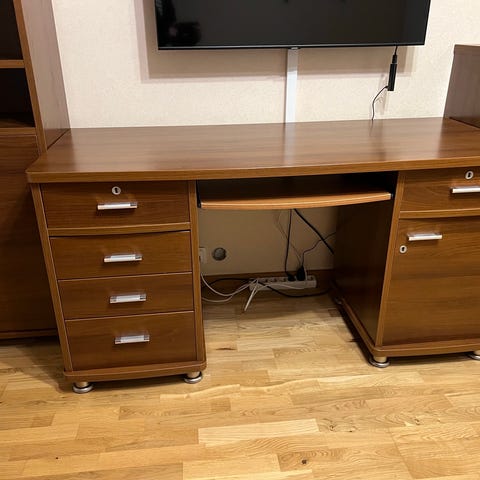 Syvyys 42cmValmistaja mahdollisesti Martela tai Kinnarps sanoo tekoäly. Liukuovet lukot ja muut kaikki toimii. Matalan kaapin takaseinässä johdolle tehty 50mm reikä. Korkean kaapin sivussa pieni kolhu.