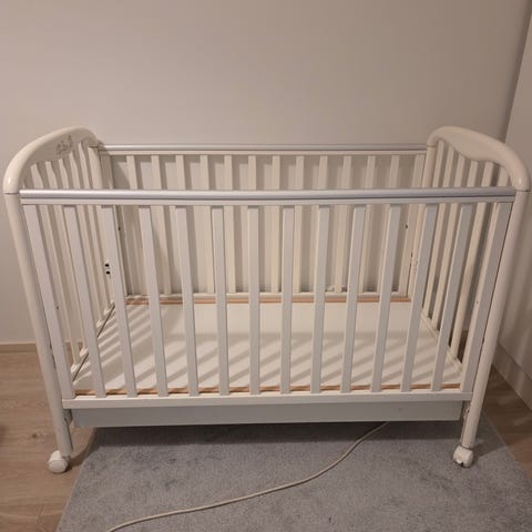 Valkoinen pinnasänky jonka saa kahteen korkeuteen + patja. Ehjä ja tukeva. Pieni jälki reunassa mutta muuten ei moitteita.