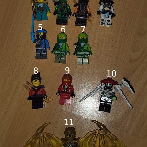 Kuvien Ninjago-ukkeleiden osat ja varusteet tarjolla.