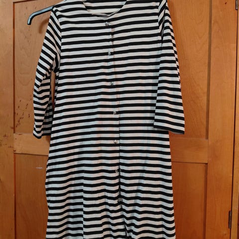 marimekko musta-valkoinen puuvillatrikoo tunika, erittäin hyväkuntoinen, koko L, kaikai 53cm, pituus 80cm, hihan pituus 35cm.