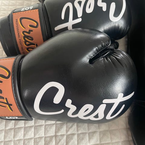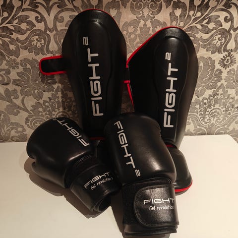 Crest Professional Fightwear nyrkkeilyhanskat musta 10oz ja säärisuojat kokoa S muutaman kerran käytetty kuin uudet.