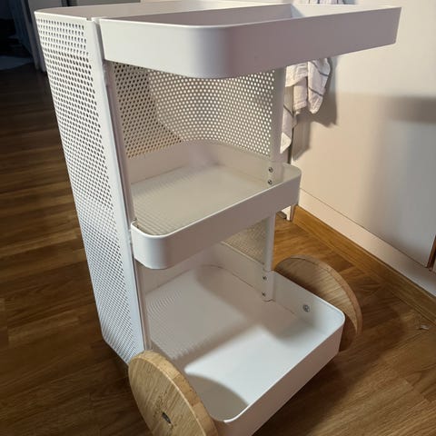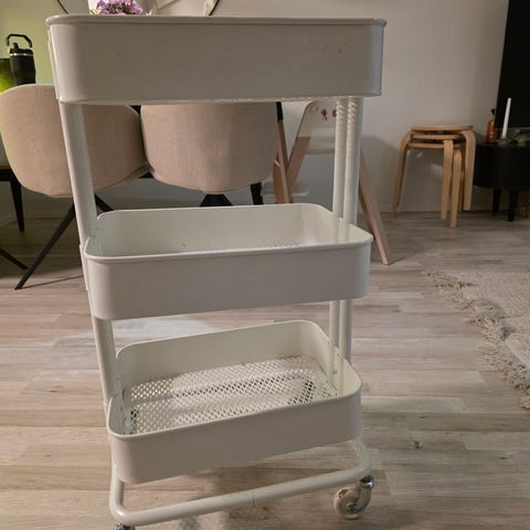 Hyvässä kunnossa oleva valkoinen Ikea Nissafors tarjoiluvaunu.