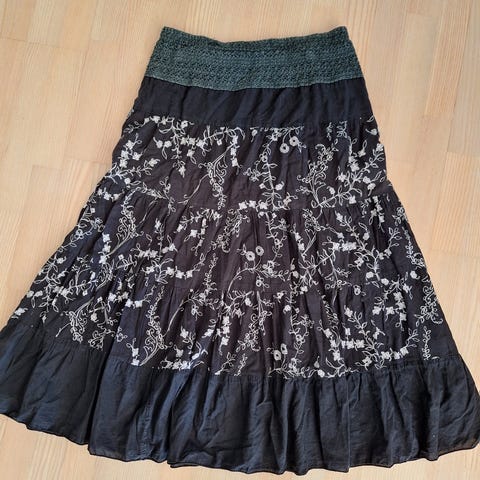 Kaunis paksukankainen muotonsa pitävä hame. Ei jousta vyötäröltä.