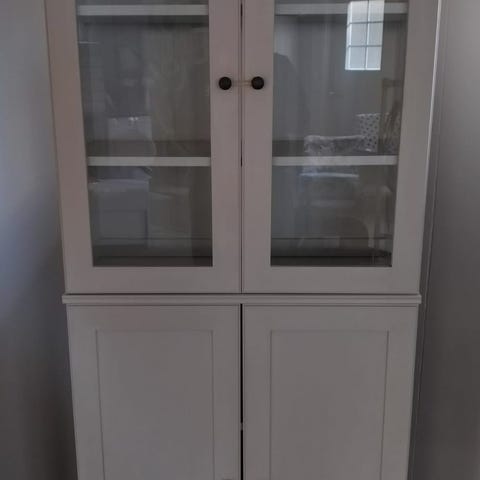 Tammi vitriinikaappi. 3 laatikkoa, 3 lasihyllyä. Painava. Aika paljon mahtuu vitriiniin tavaraa.