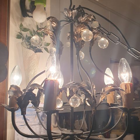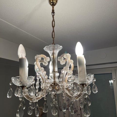 Stockmannin kattokruunu, paikat 6:lle polttimolle (E14-kanta). Korkeus n.50, halkaisija n.40. Lasit tallessa, ei puuttuvia. Nouto Tuusula, Paijala.