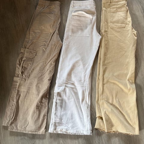 Suorat lahkeet ja pehmeä materiaali 100%puuvillaa. Vyötärössä säätö, joustokuminauha ja napit.