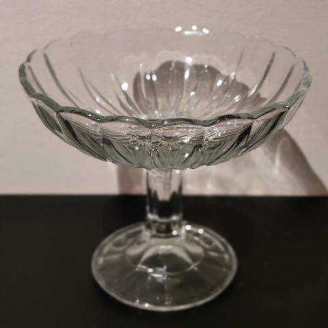 8 kpl vanhoja lasikulhoja. 3 kulhossa yksi pieni lohkeama reunassa. Pohjan halkaisija on n. 9cm. Korkeus on n. 5cm. Yläosan halkaisija on 15cm.