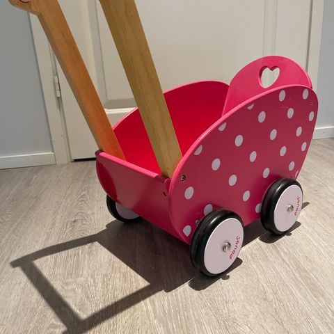 Myydään vaaleanpunaiset puiset nukenvaunut. Merkki Jabadabado.