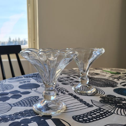 Annetaan kulhoja 6kpl. Värinä puoliksi vihreä ja puoliksi valkoinen, keskellä hyvin vaalean sininen raita. Siistissä kunnossa ja ehjiä. Mitat kuvissa 2&3. Yhden kulhon pohjassa pieni halkema "jalassa", ei vaikuta käyttöön. Kulho pysyy tukevasti pöydällä. Osassa kulhoista jotain jälkiä ulkoreunoilla (kuva 6). Haku Savonlinnan Hernemäeltä.