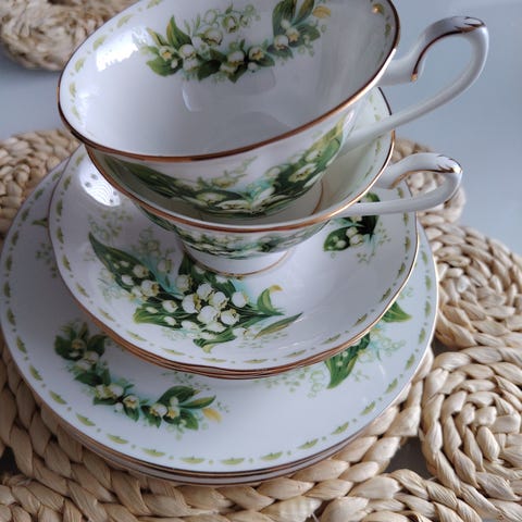 Kielo astiasto, luuposliinia, 8kpl + tarjoiluvati kaikki ehjiä.