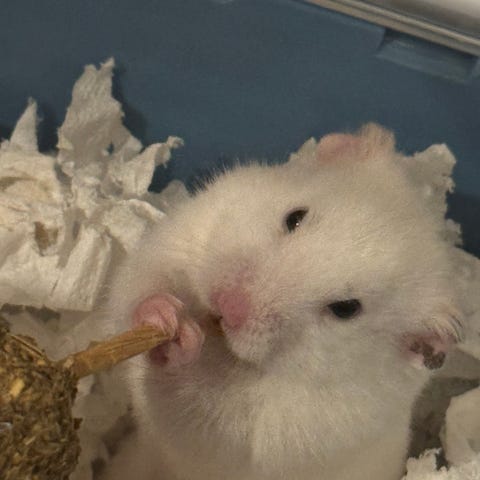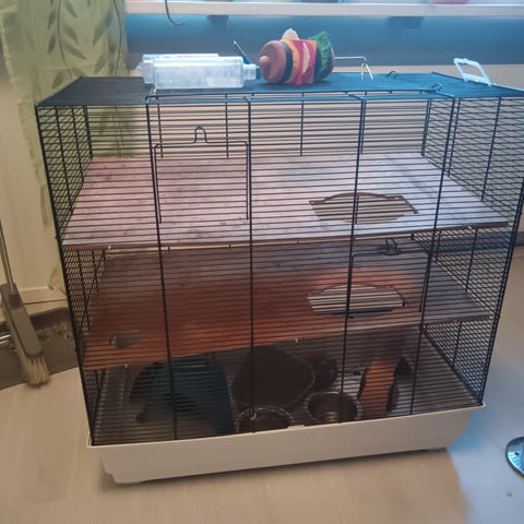 Hamsteri häkki sinisellä muovipohjalla ja valkoisilla metalliverkoilla. Mukana muovisia lisäosia kuten juoksupyörä, ruokakuppi ja putkisto. Häkissä myös juomapullo. Soveltuu pienille jyrsijöille kuten hamstereille. Huomioithan, että kulmassa on pieni reikä.