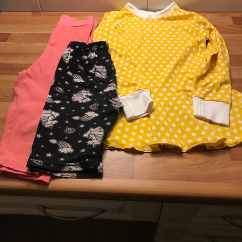 Myydään lasten vaatesetti koko 110-116. Vihreät collegehousuissa on nukkaa mutta ehjät. Trikoo pusero pitkät hihat, legginsit, pitkät alushousut ja ohuet housut.