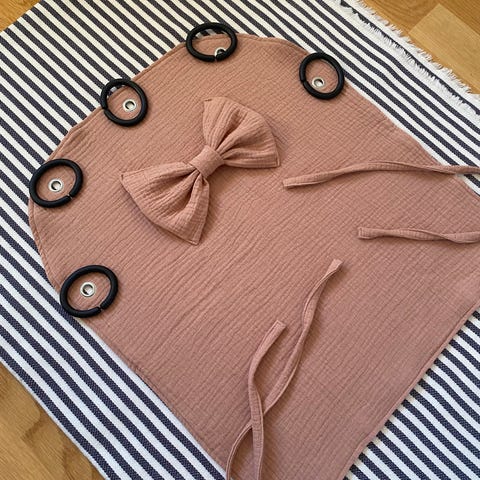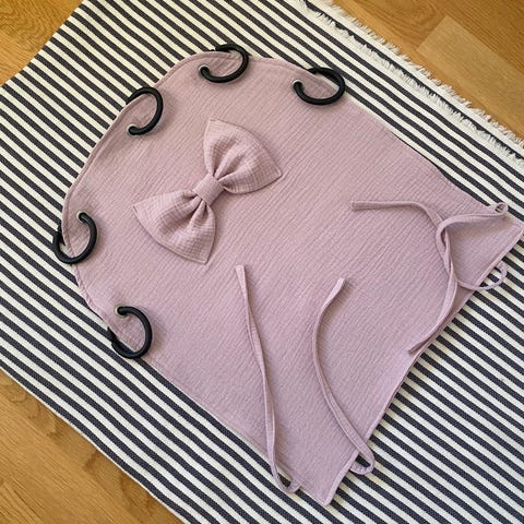 Uusi rusetillinen vaunuverho beigestä vohvelikannaasta. Korkeus n.49cm leveys n.41cm. Verhoon voi valita joko pienemmät renkaat tai suuremmat. Nouto Espoosta tai toridiili.