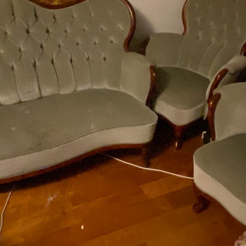Talonpoikais rokokoo sohvaryhmä, kaksi nojatuolia ja sohva. Puukehyksessä sekä yhden tuolin selässä näkyy käytön jälkiä. Koiratalous.