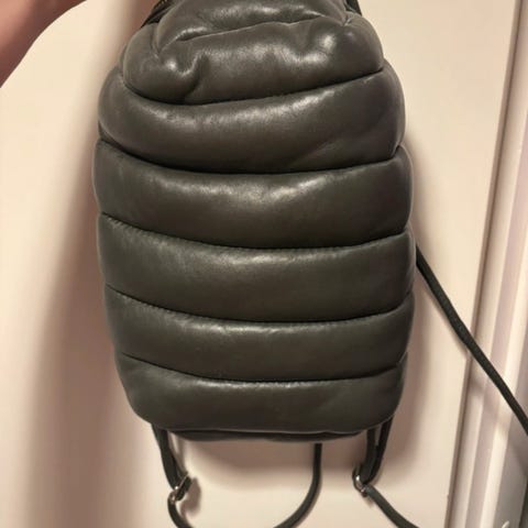 Marimekon vihreä reppu pehmeää, topattua nahkaa. Reppu suljetaan vetoketjulla ja takana on kaksi vetoketjutaskua. Sisäpuolella pieni vetoketjutasku. Säädettävät olkahihnat ja metallinen lenkki, josta laukun saa myös ripustettua helposti.