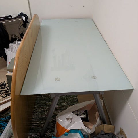 Tarpeettomana myyntiin hyväkuntoinen työpöytä. Koottu Ikean laatikostosta ja jalasta sekä lasiliikkeessä teetätetystä työtasosta. Lasissa muutamia pieniä naarmuja, laatikostol päällä hieman kuprua (kuvassa). Lasi on laadukas, kestävä ja todella painava.