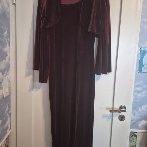 Punainen ilta- tai juhlapuku. Sopii vaikka esiintymiseen tai vanhojen tansseihin. Puvussa on koristeelliset yksityiskohdat yläosassa ja pitkä helma. Materiaali on kiiltävää ja sopii juhlavaan käyttöön. Mukana huivi samaa kangasta.
