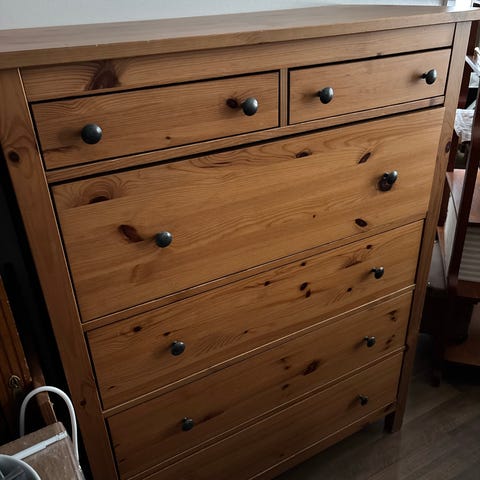 Maalattu vihreäksi tikkurilan tunturipaju-maalilla. Pientä käytönjälkeä näkyy, päällä hentoja tummentumia ja alimmassa vetolaatikossa selkeimmät tummat jäljet. Pyyhitty vain märällä liinalla, voi olla saatavissa vielä siistimpään kuntoon (jos ei muuten niin maalaamalla).