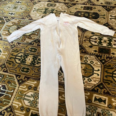 Paksu ja ihanan pehmoinen Ruskovillan villahaalari. Koko 100 cm. Alkuperäinen väriluonnon valkoinen, mutta värjätty vihertävän harmaaksi. Edessä Ruskovillamerkin vieressä tahraa (kts.kuva) muualla siellä täällä pientä pistemäistä tahraa, mutta yleisilme siisti. Ehjä.