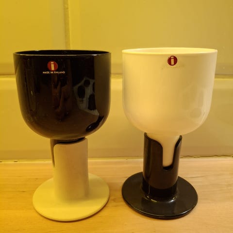 Myydään 6 kpl Jorma Vennolan Kaveri laseja. Yläosa on lasia ja jalkaosa on muovia. Yhden lasin muovijalka on hieman haljennut. Pieni vaurio jalassa otettu huomioon hinnoittelussa.