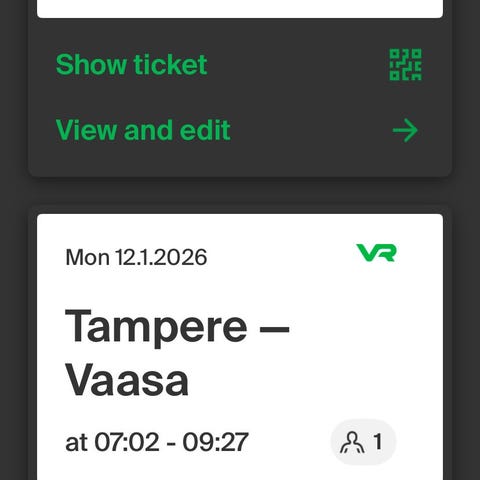 Aikuisen junalippuja. Käy molempiin suuntiin ko. välin juniin, joissa varatessa tilaa. Hp. 24€ per lippu. Maksu käy esim. mobilepaylla.