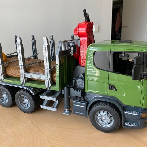 Bruder Scania puutavara-auto sininen. Lastattava puutavara-auton lelu, jossa on puutavaran kuljetukseen soveltuva perävaunu ja nosturi. Valmistettu muovista, soveltuu lasten leikkeihin.
