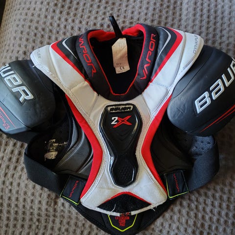 Ehjät, reilu kauden käytetyt hartiasuojat. Normaalia kulumaa. Koko jr S, pelimiehen pituus 127-142cm.