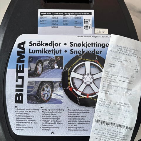 Lumiketjut avaamattomassa tehtaan paketissa , sopivuus näkyy kuvasta. Pakollinen varuste monin paikoin euroopassa.