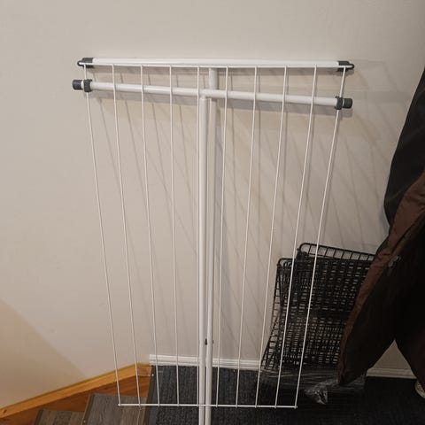Siistikuntoinen ja toimiva lämpenevä kuivausteline. On käytetty ja jotain pieniä kolhuja on, yleisilme siisti. Hyvin toimii. Voidaan asentaa seinään, kiinnikkeet mukana. Syvyys 25cm ja leveys noin 88cm.