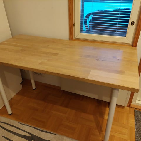 Puinen pöytä, jossa on kaksi laatikkoa. Pöydän pinta ja jalat on valmistettu puusta, ja se soveltuu esimerkiksi työ- tai kirjoituspöydäksi. Kirsikan värinen.