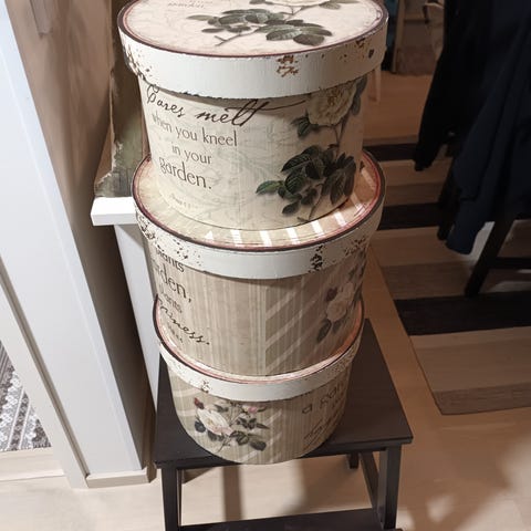 Beige hatturasia, mokkamainen pinta. Ulkopinnassa pari käytön jälkeä, katso kuvat. Sisältä siisti, viimeinen kuva.