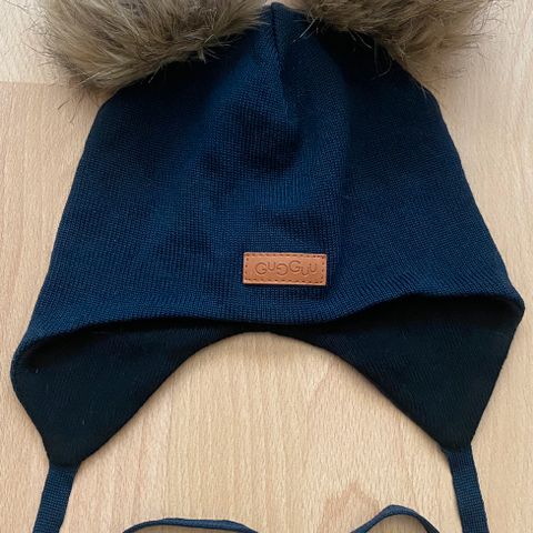 Pipon päällä on kaksi pörröistä tupsua, jotka tuovat leikkisyyttä asuun. Nauhallinen malli pysyy hyvin paikoillaan myös liikkuvalla lapsella. Etuosassa viimeistelty tekonahkainen Gugguu-logo tuo modernin yksityiskohdan.