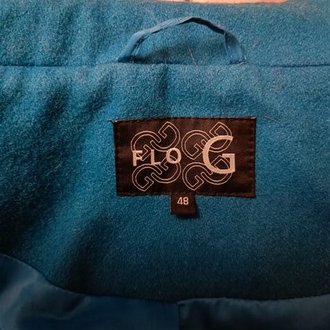 Hyväkuntoinen ruskeasävyinen, vuorillinen villakangastakki (villasekoitetta), jossa huppu. Koko 48, pituus n. 95 cm. Kaksi taskua, yksi varanappi mukana. Eläintalous.