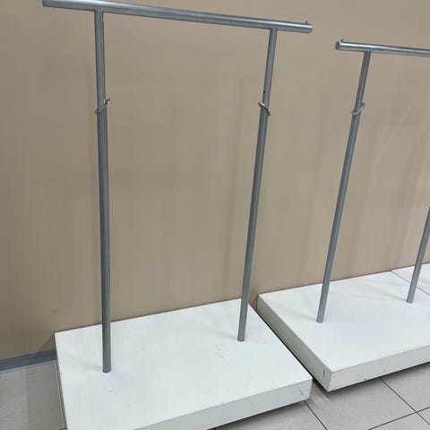 Vaateripustin, valmistettu metallista, värit tumman harmaa ja valkoinen. Sopii vaatteiden ripustamiseen ja säilyttämiseen. Vankka rakenne ja tukeva jalusta. Käytetty sisätiloissa.