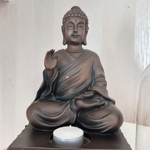 Budha tuikkuteline kivillä. 4- tuilkupaikka. Ei käytetty. Upeat värit, kulta- puna - musta. Upeasti tehty, esineenä/ koristeleena upea.