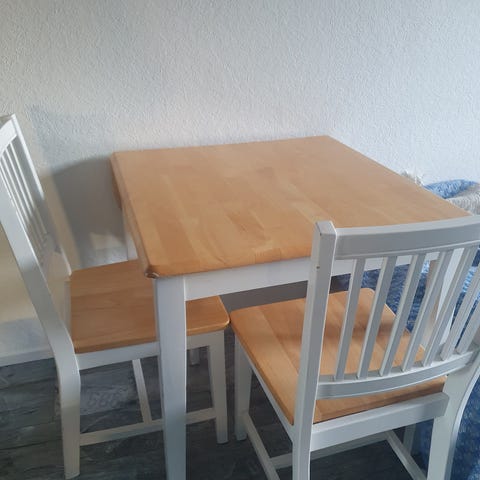 Ruokapöytä uuden tieltä pois. Pöytää pystyy jatkamaan 40cm jatkopalalla. Palan saa säilytettyä pöydän alla. Tukeva pöytä, pinnassa käytönjälkiä. Meillä ollut liina päällä niin ei ole haitannut jäljet.