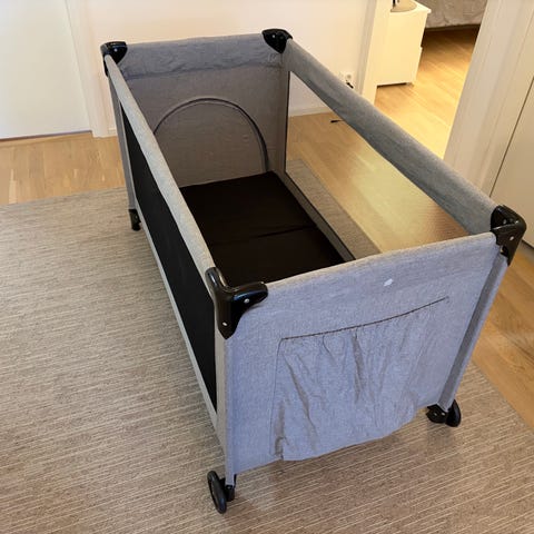 Beemoo-matkasänky kulkuluukulla, hyvässä kunnossa. Vain nouto.