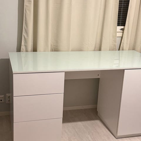 Työpöytä mustalla kannella ja valkoisella rungolla. Koko 135x59cm