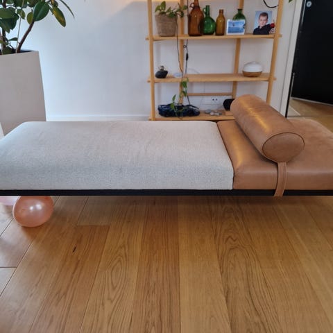 Myydään: Adean daybed 400 €. Espoo. Ostettu Vepsäläiseltä. On ollut käytössä, mutta nyt ei harmittavasti löydä paikkaansa. Luonnonvalkoinen tekstiili ja samppanjan värinen nahka. Musta metallirunko. Ihana 🤍🧡