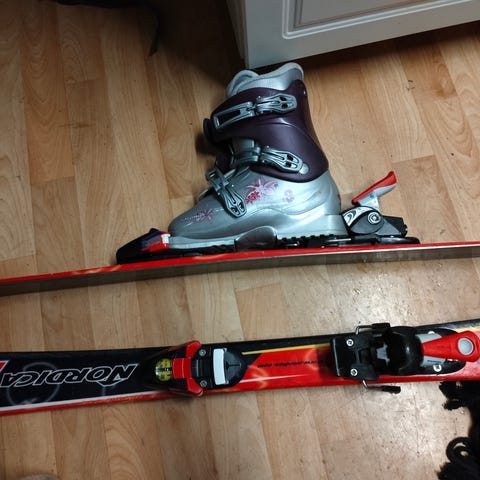 Myydään laskettelusetti eli sukset ja monot (sauvoja ei oma lapsi vielä tässä kohtaa käyttänyt).