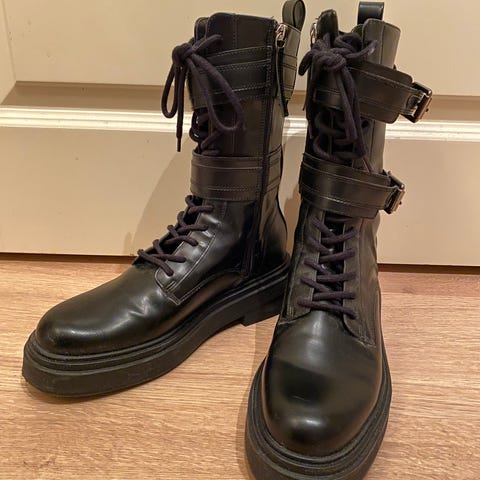 Siistikuntoiset vetoketjulliset nilkkurit. Keinonahkaa, koko reilu 39, menevät hyvin 39/40 -kokoiseen jalkaan. Vetoketju sisäsyrjässä helpottaa pukemista. Pohjassa kuviointi, joten eivät ole erityisen liukkaat talvikeleillä. Kunto siisti, solkien alla hieman kulumaa, ks. kuvat. Mukaan saattaa eksyä pari kissankarvaa.