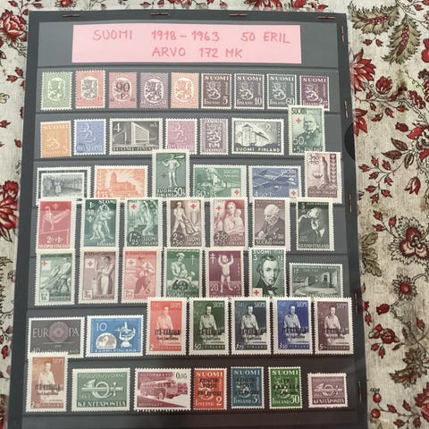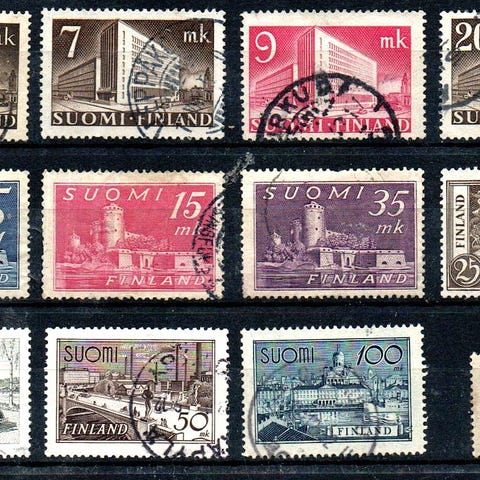 Suomi postimerkkisarja,v.1949 ja v.1950 käyttämättömät,leimaamattomat postimerkit, sisältää 6 erilaista merkkiä eri väreissä. Merkit ovat perinteisiä postimerkkejä, sopivia keräilyyn.