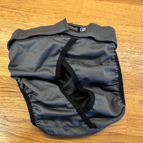 Simple Solution juoksuhousut koossa XL. Olleet käytössä käyttölinjaisella labradorinnoutajalla (25 kg). Pientä kulumisen jälkeä, joka näkyy kuvissa (nyppääntynyt sisäpuolelta, tarrapinnoissa jälkeä). Ei haittaa käyttöä.