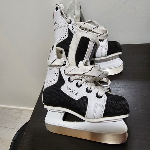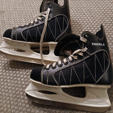 Tackla lasten jääkiekkoluistimet, koko 26. Useammalla lapsella käytetty mutta kunto edelleen hyvä. Pohjallisen mitta 17,5 cm. Luistimissa mustavalkoinen väriyhdistelmä, nauhakiinnitys.