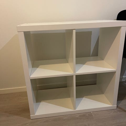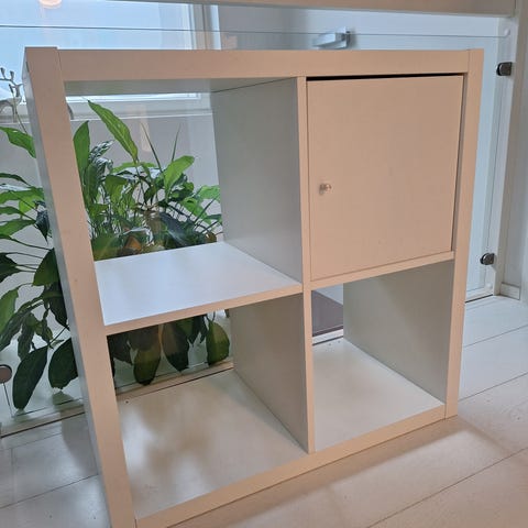 Siistissä kunnossa oleva Kallax hylly. Kannessa pieni n. nuppineulan pään kokoinen jälki (kuvat 2 ja 3). Ostettu uutena toukokuussa 2025. Harmaat laatikot saa myös halutessaan mukaansa.