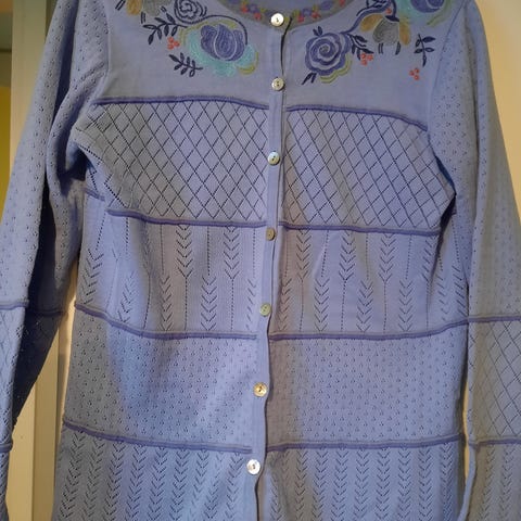 Kolme kertaa päällä pidetty ja kerran pesty paksu neuletakki.